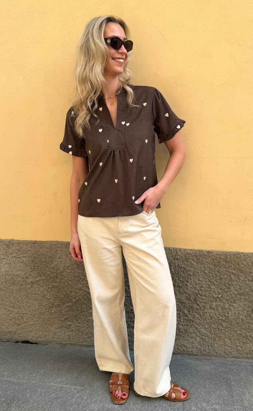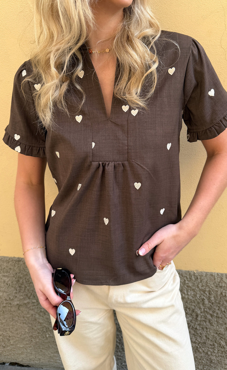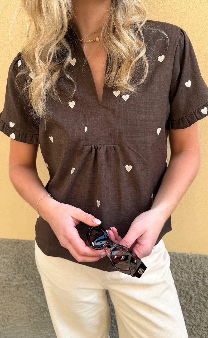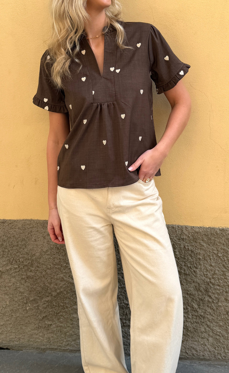 Say INA Copenhagen Topp - Winnie New - Dark Brown W. Off White Embroidery Hearts